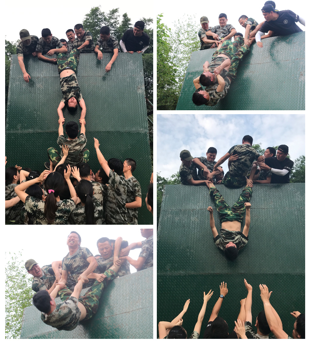 同样4米高的逃生墙也不能阻止我们前进的信心,队长安排好人墙的建立,为整个团队的出色完成任务打好基础,前期上墙的男队员,墙下做保护的队员,群策群力、相互信任、团队协作,只用了5分钟全队人员胜利攀登。